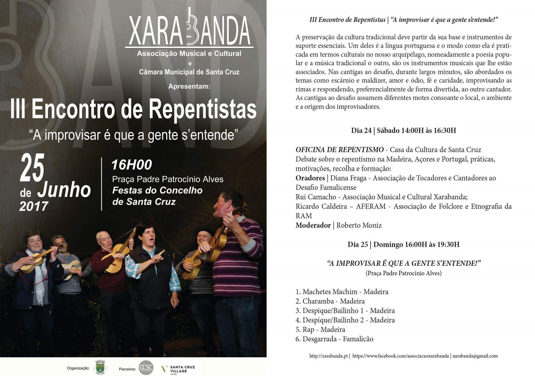 A Associação Musical e Cultural Xarabanda e a Câmara Municipal de Santa Cruz promovem neste próximo fim de semana 24 e 25 de Junho 2017 o III Encontro de Repentistas – “A improvisar é que a gente s’entende”.
