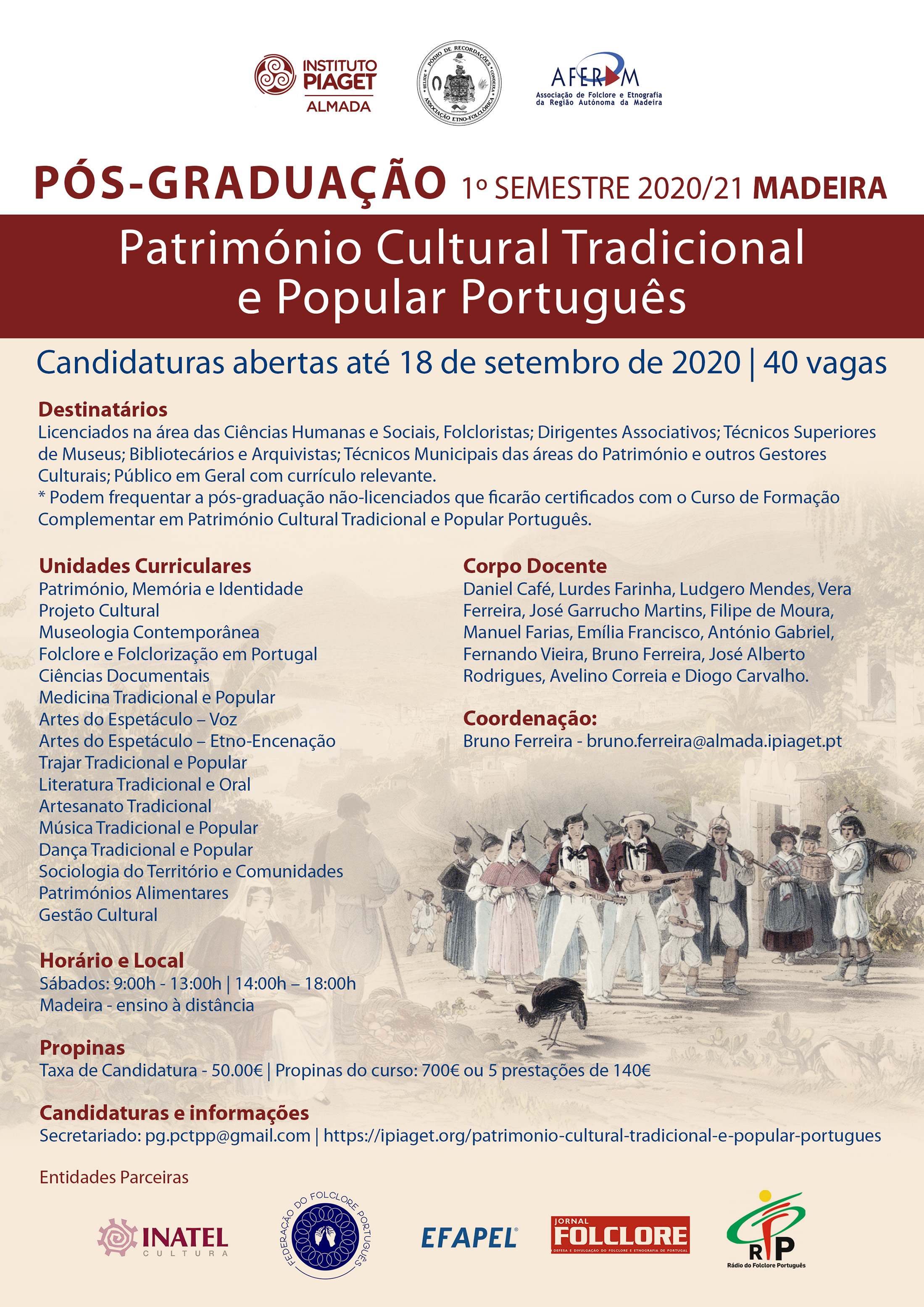 Alguma dúvida relacionada com plano de estudos, consultem o sítio institucional: https://ipiaget.org/patrimonio-cultural-tradicional-e-popular-portugues/Outras dúvidas sobre a candidatura podem entrar em contato com o secretariado pg.pctpp@gmail.com ou aferam.madeira@gmail.com.