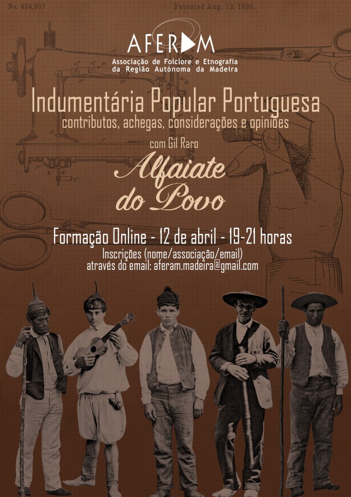 No âmbito do Plano de Atividades da AFERAM, Associação de Folclore e Etnografia da Região Autónoma da Madeira, vai-se realizar uma formação não presencial, pela plataforma ZOOM, na próxima segunda-feira, dia 12 de abril das 19 às 21 horas, com o tema: Indumentária Popular Portuguesa – contributos, achegas, considerações e opiniões, com Gil Raro (alfaiate do povo).