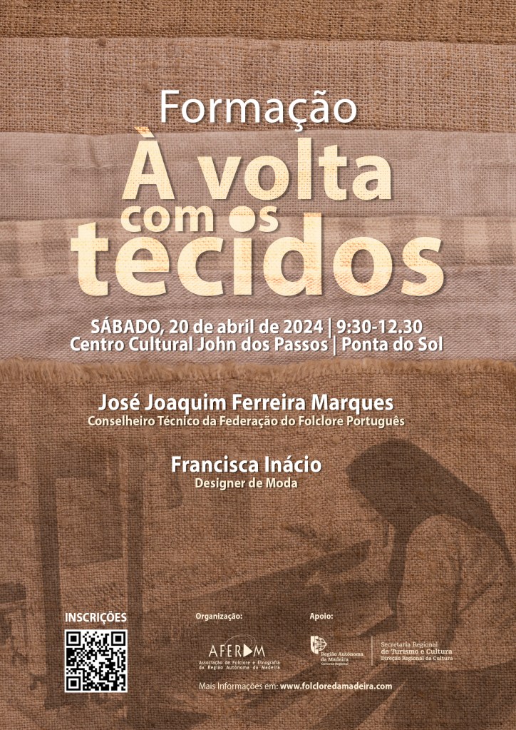 A AFERAM – Associação de Folclore e Etnografia da Região Autónoma da Madeira vai realizar uma formação “À volta com os tecidos” no dia 20 de abril, sábado, das 9:30 às 12:30 horas no Centro Cultural John dos Passos, Ponta do Sol.