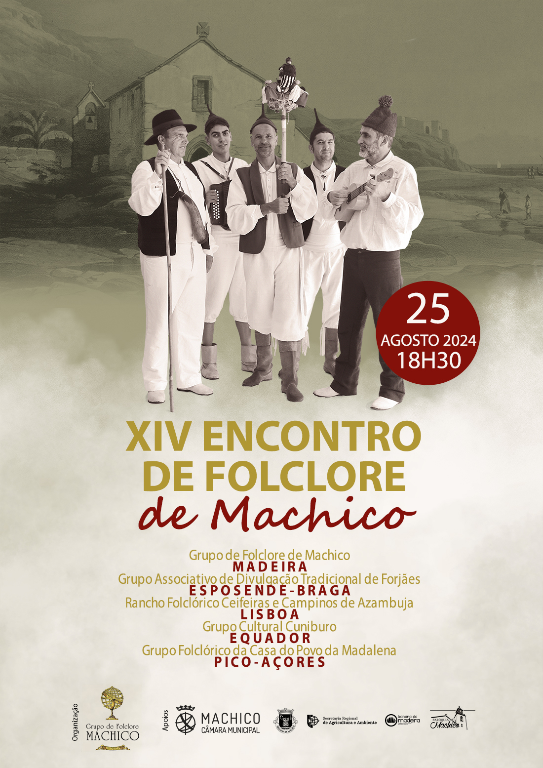 O Grupo de Folclore de Machico irá realizar o XIV Encontro de Folclore de Machico no dia 25 de agosto, Domingo, pelas 18.30 horas no Largo da Praça. O espetáculo contará com a presença dos grupos de folclore de MACHICO, Grupo Associativo de Divulgação Tradicional de Forjães – ESPOSENDE | BRAGA, Rancho Folclórico Ceifeiras e Campinos de Azambuja – LISBOA, Grupo Cultural Cuniburo – EQUADOR e Grupo Folclórico da Casa do Povo da Madalena – PICO | AÇORES.