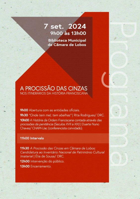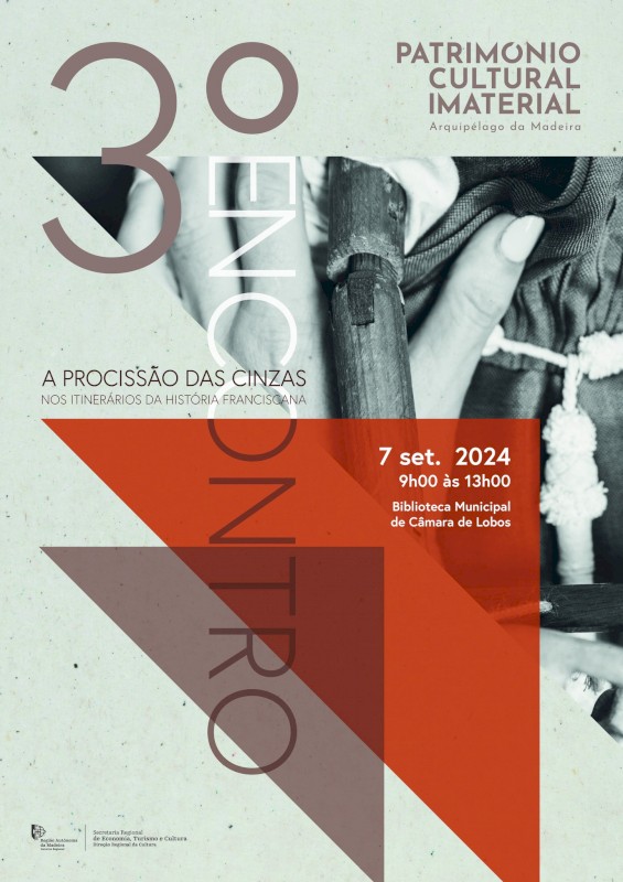 Irá decorrer no próximo dia 7 de setembro, entre as 9h00 e as 13h00, o 3.º Encontro de Património Cultural Imaterial do Arquipélago da Madeira – A Procissão das Cinzas nos Itinerários da História Franciscana, na Sala Polivalente, da Biblioteca Municipal de Câmara de Lobos, organizado pela Secretaria Regional de Economia, Turismo e Cultura , através da Direção Regional da Cultura, Direção de Serviços de Património Cultural / Divisão de Estudos do Património.