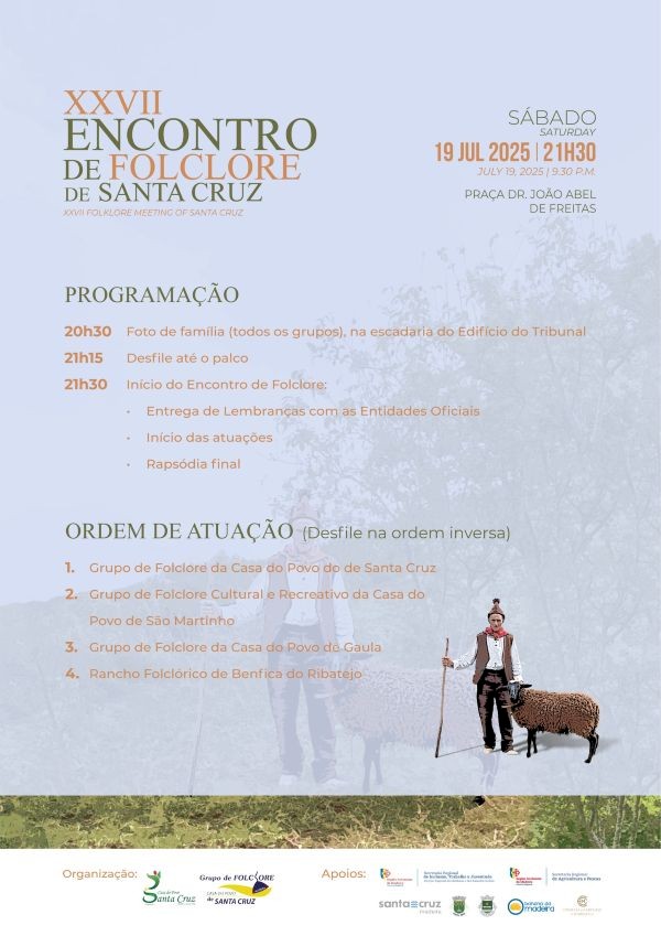 A Casa do Povo e o Grupo de Folclore da CP de Santa Cruz promovem mais uma edição do Encontro de Folclore, que acontece dia 19 de julho, a partir das 20h30 na Praça Dr. João Abel de Freitas, reunindo grupos da Madeira e do continente para celebrar e valorizar as tradições culturais e musicais.